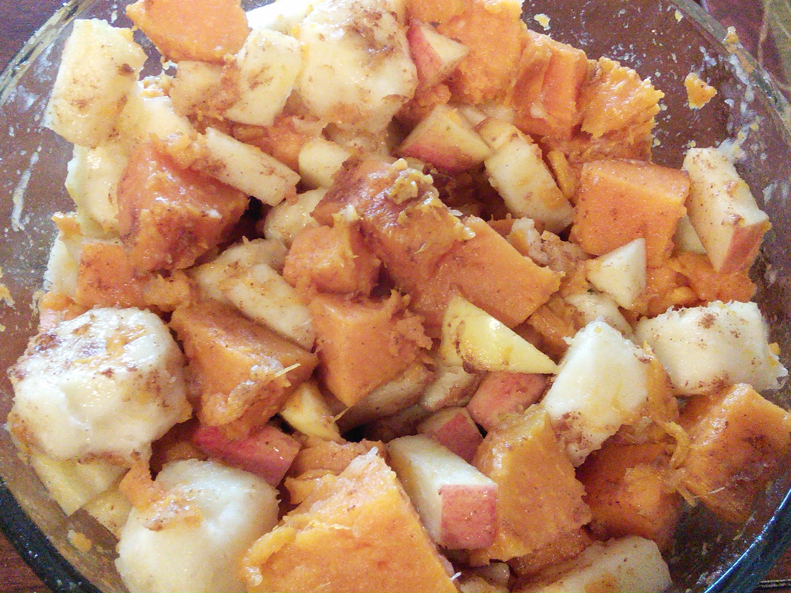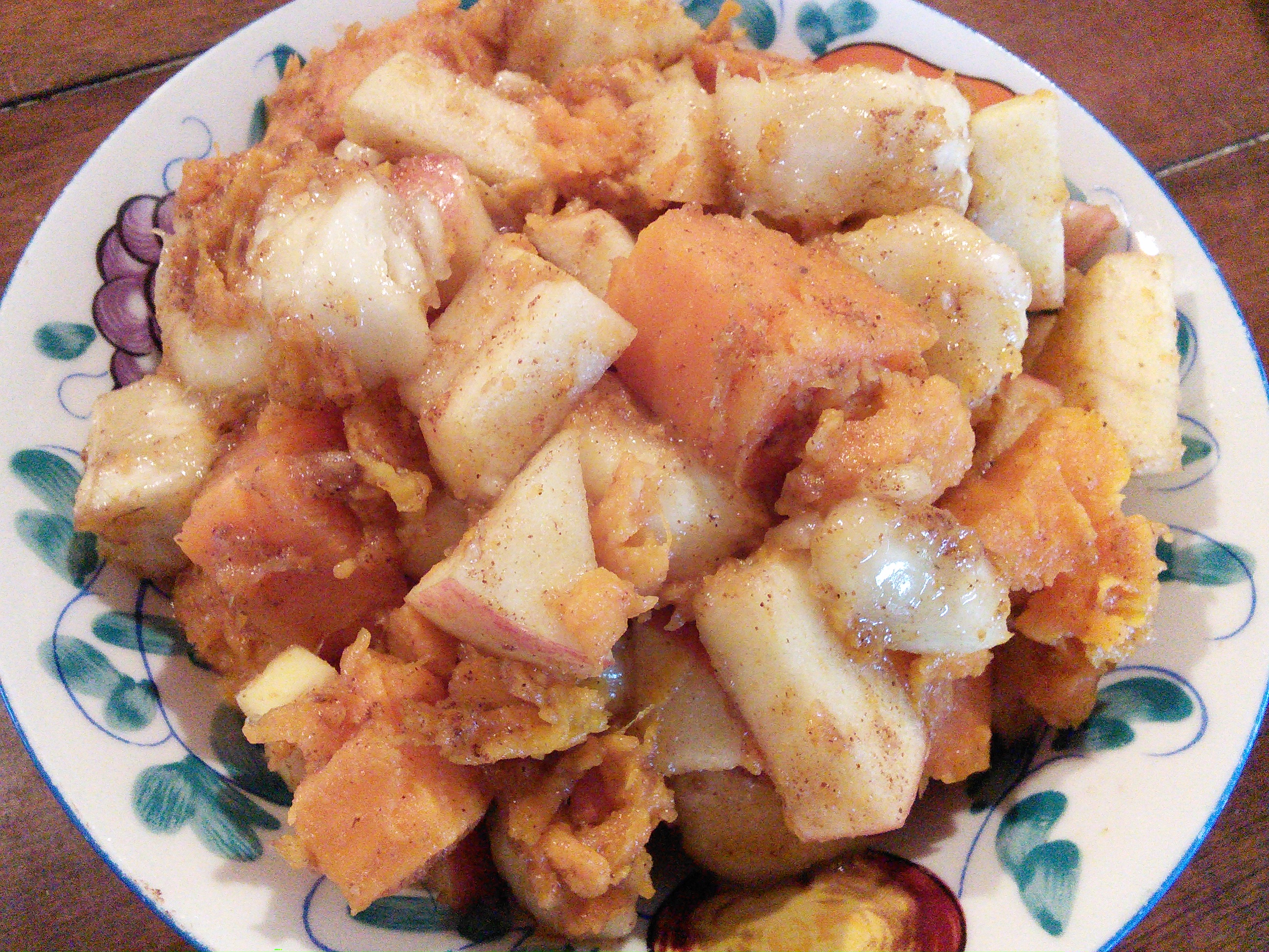 The first time I made this recipe from The China Study All-Stars Collection cookbook I wasn’t really expecting much from it. With only three components, and a minimal amount of cinnamon, how could this possibly taste good? Also, the texture seems weird…I mean, sweet potato, apple, and banana? The first time I made it I decided to scrap the recipe directions and cooked the sweet potatoes and apples in a crock pot for a few hours. It turned out really well! So I thought, hey, why not try making this a few different ways and see how it turns out? After experimenting with it, I think the original recipe might actually be the best way to do it. The crock pot version gives everything more of the apple flavoring, and the apples are nice and mushy, but the sweet potatoes are too mushy for my tastes. I’ve also tried just microwaving the sweet potatoes. It isn’t bad, but it’s not as good as actually baking them (like the recipe calls for). You can microwave them to save time and have this as a quick breakfast—waiting on them to bake in the oven may be impractical for a get-up-and-go type of morning.