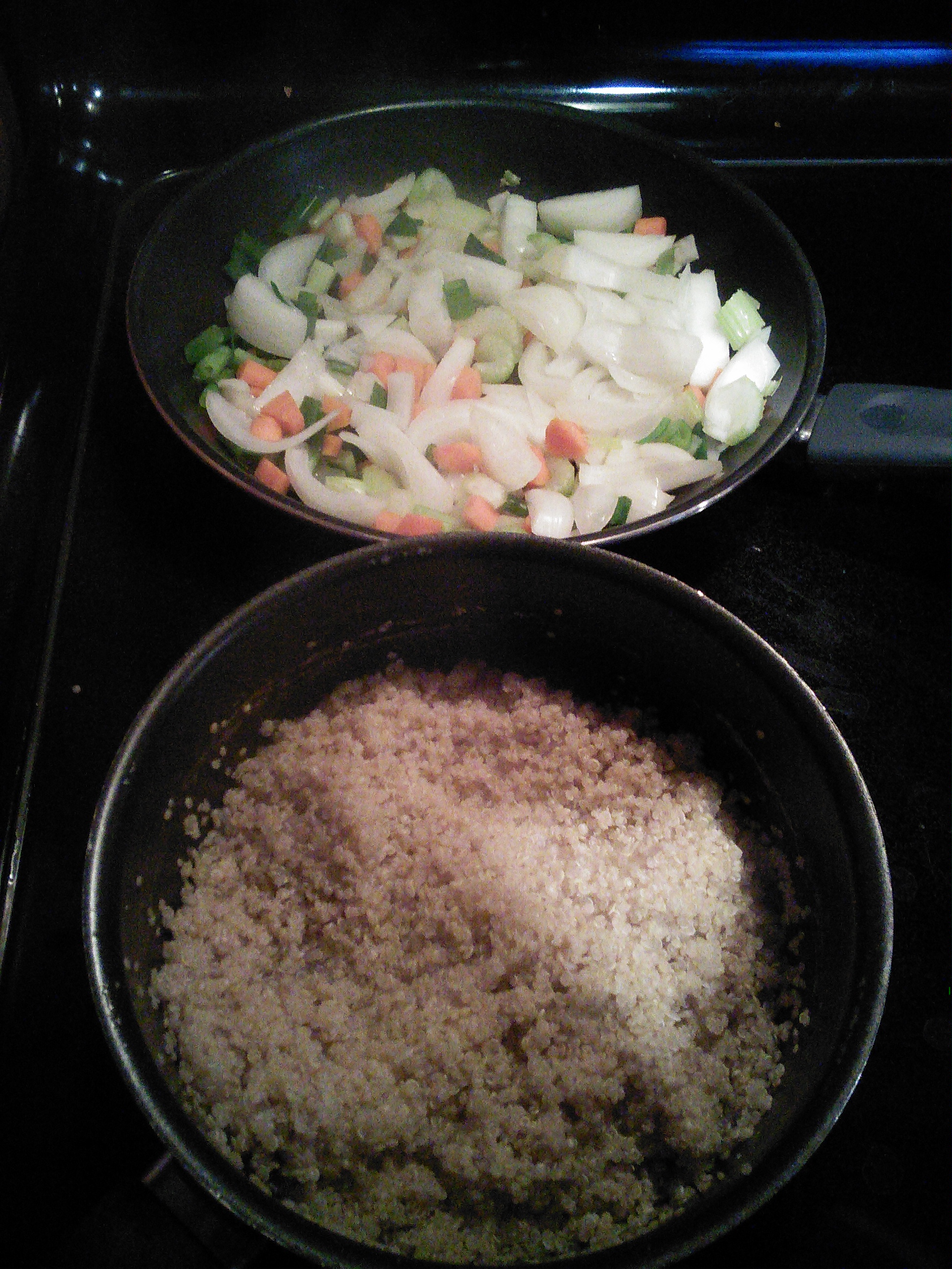 Start cooking the quinoa according to package directions. Roughly chop all the veggies. Saute the veggies (using water, veg. broth will change the flavor a bit) until they are soft. While you are letting these two cook, mix the sauce ingredients and put it in the fridge until you’re ready to make the sandwiches.
