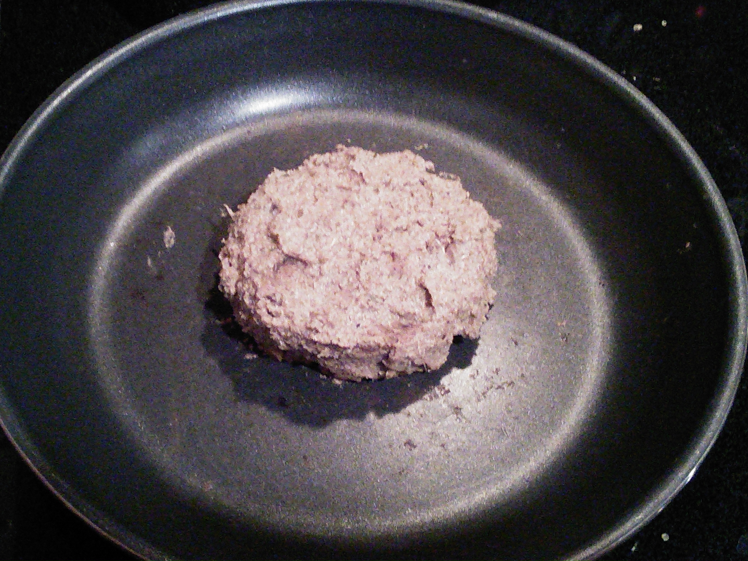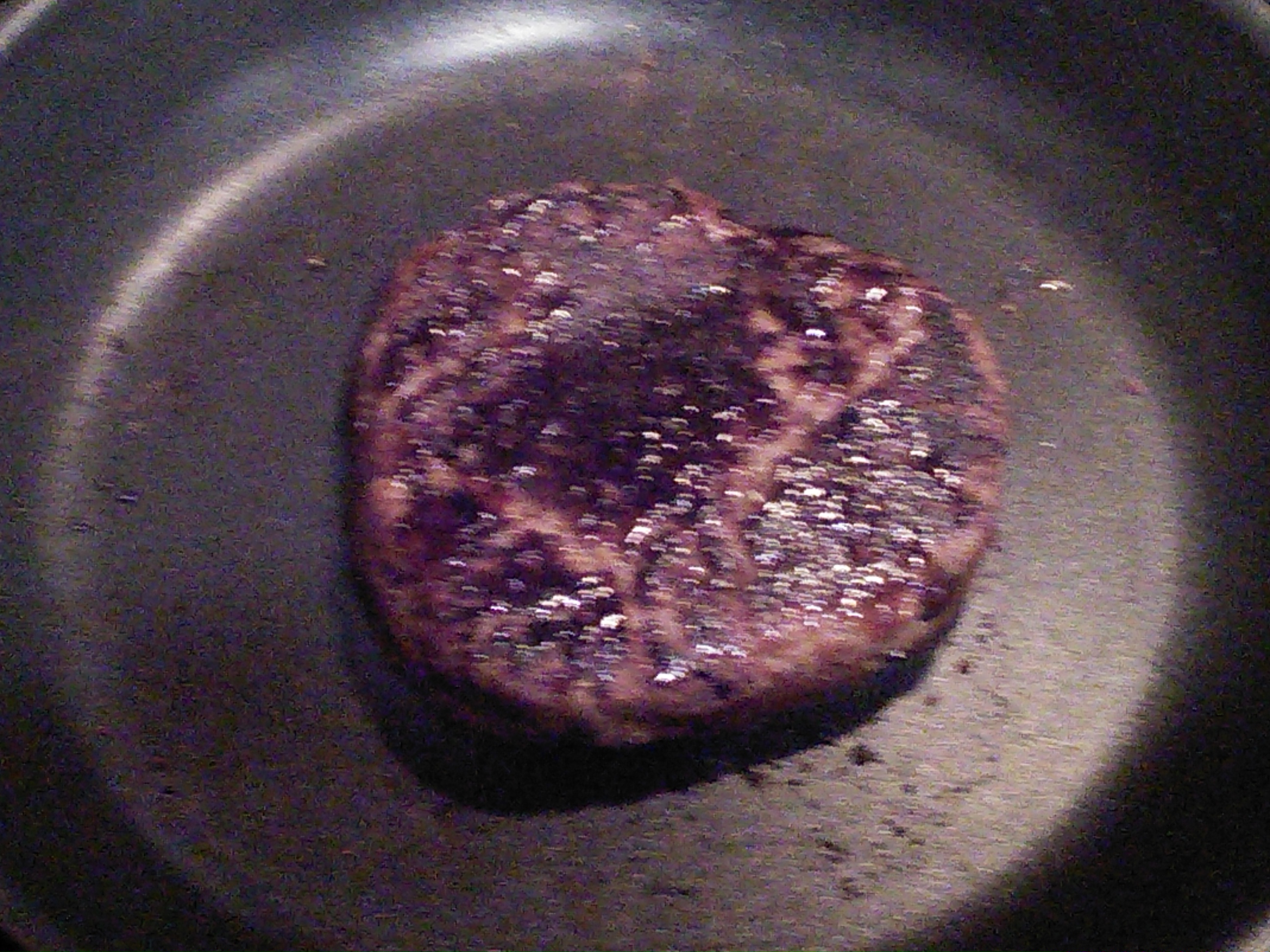 When the burger mix is chilled enough, make patties. There are two ways to cook this: in a skillet or in the oven. If you cook these in a skillet, form the patty and cook on each side for about 6 minutes over medium-high heat. Brush with the hoisin sauce on both sides and cook for an extra minute to caramelize the sauce. The first two patties I made I cooked in a skillet, but the results were not good. The sides of the patties never browned but the top/bottom were burning. Pictures below so you know what it looks like. In the second picture the top looks browned but that’s just caramelized hoisin sauce. When I tried to eat these on bread they squished everywhere. I recommend using the oven instead.