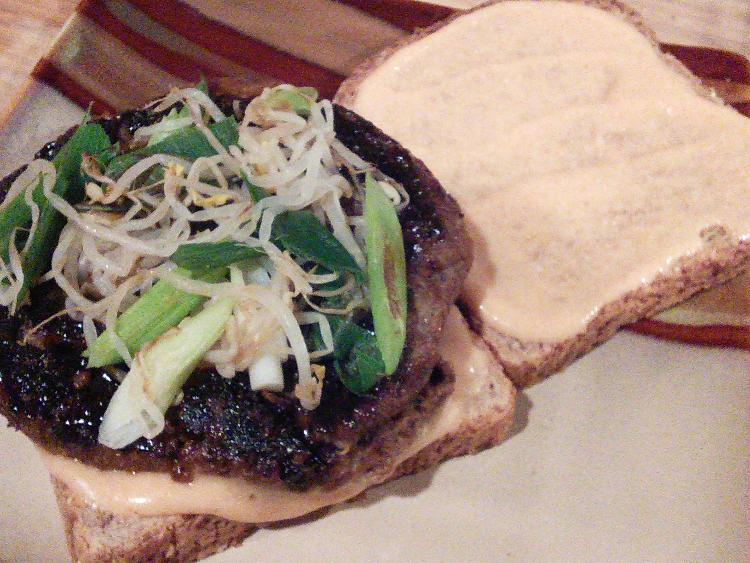 When the burgers have cooled slightly, you’re ready to eat! Slather your buns/bread slices with the spicy mayo and toss the bean sprouts/green onions on the burger. Done!
