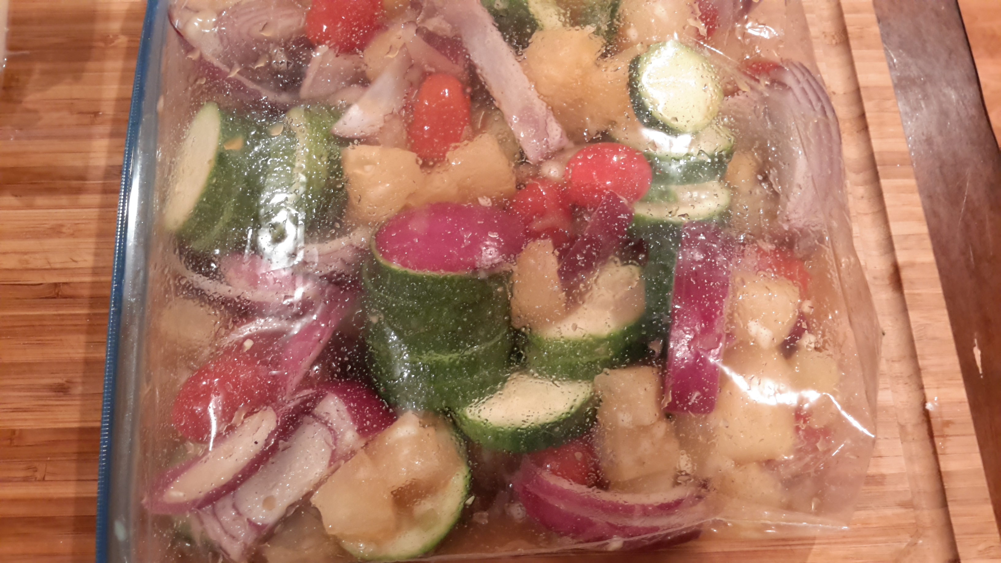 Put the marinating veggies/tofu in the fridge at least an hour. I recommend doing it overnight for maximum pineapply-flavor.