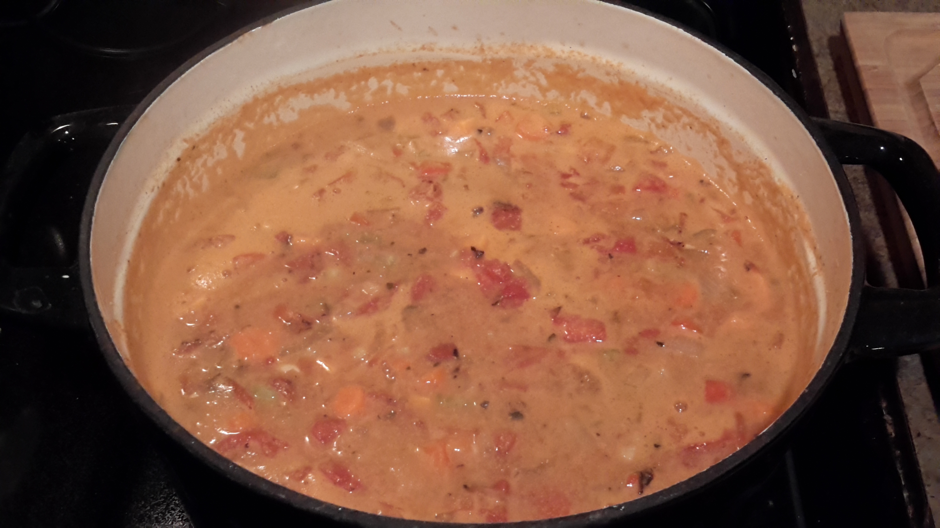 Add in all the veggies, the canned tomatoes and its juice, the last 5 cups of vegetable broth, the cashew cream, and all the spices. Stir it all up. DO NOT add the chickpeas and spinach/kale yet!