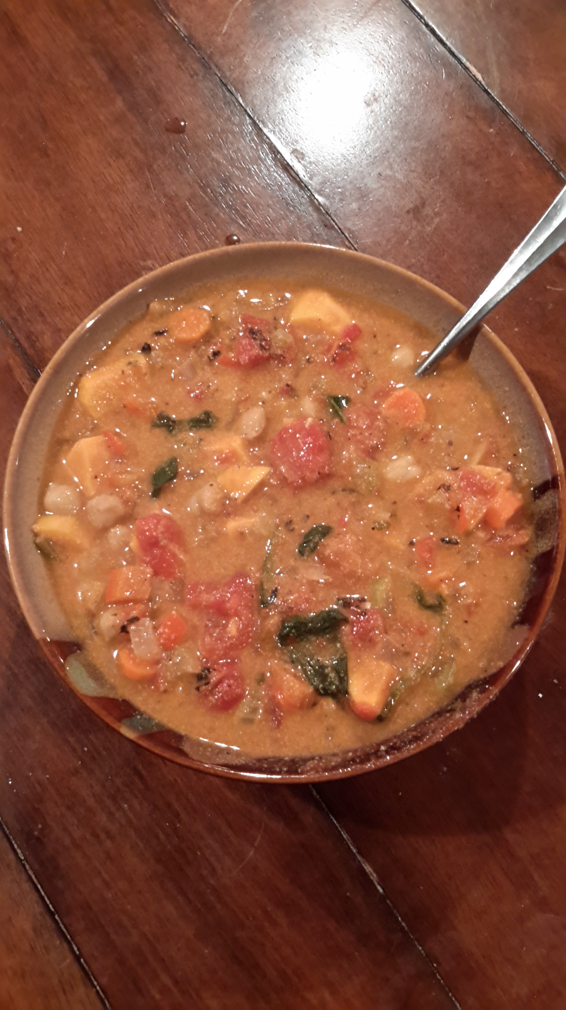 In the last 5 minutes of simmering stir in the chickpeas and spinach/kale.