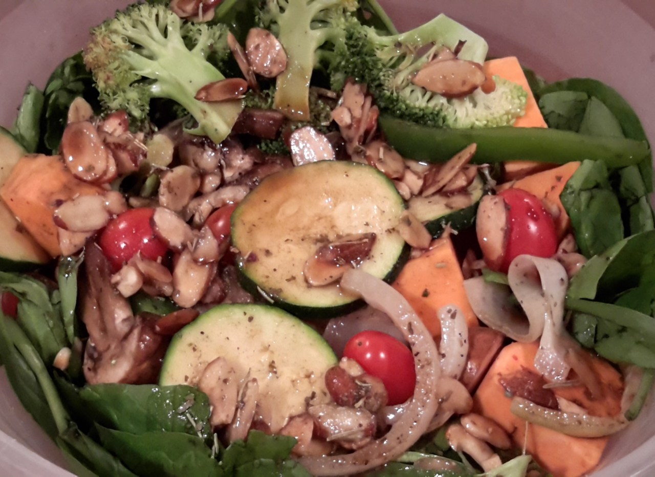 Prepare all veggies and place them in a large baking pan (except the spinach). Sprinkle with the garlic powder, onion powder, sea salt, and pepper. Bake veggies for 20 minutes.