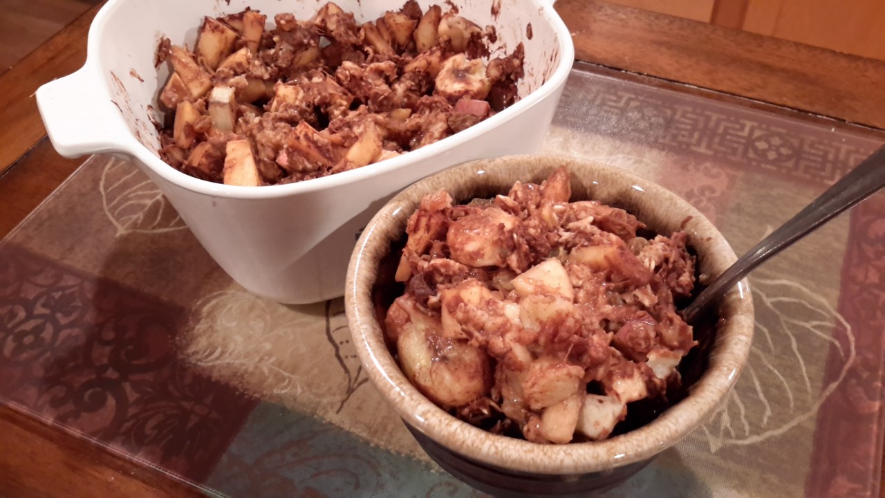The breakfast bowl is super easy to make but does require a half an hour in the oven. This recipe from SimpleVeganBlog is as simple as “dump the stuff in the bowl, mix, bake.” If you want more of an apple pie flavor, add in about ½ to 1 tsp. of apple pie spice. The cinnamon and nutmeg are yummy but it doesn’t taste as apple-pie-y as I would like.