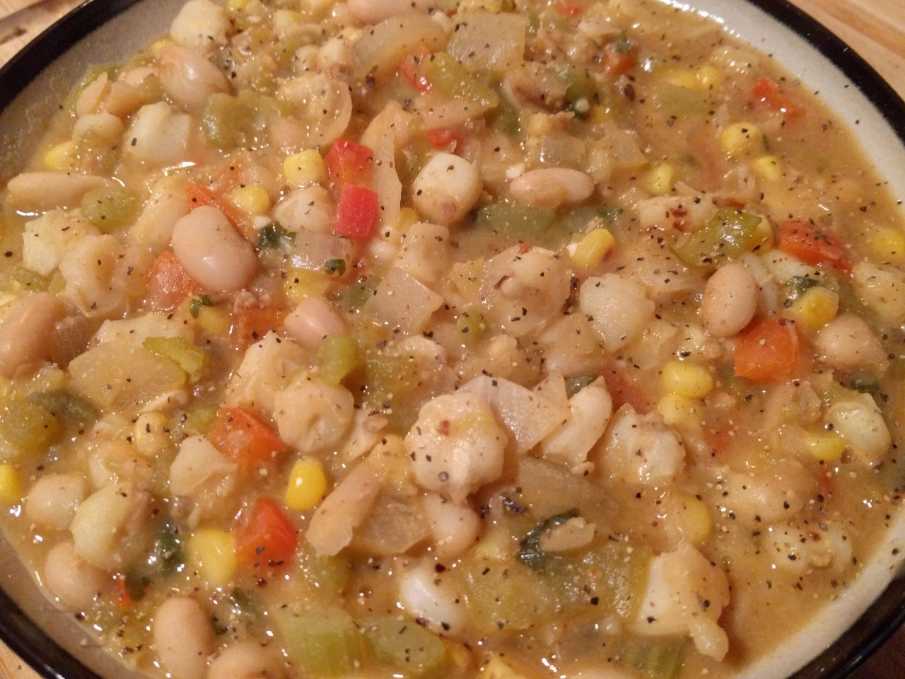 Lower heat to Medium. Add to the pot. the remaining ½ cup of vegetable broth, the last can of beans, the bean and broth mixture, and all remaining ingredients. Cook for 20-30 minutes until vegetables are tender and the broth is creamy.