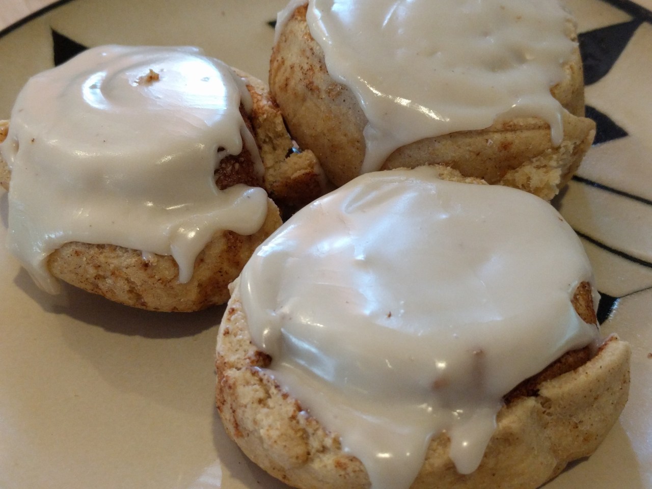 While they are in the oven, whisk together the powdered sugar and 1-2 tbs. of almond milk to make the icing for the rolls.