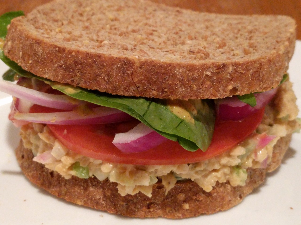 Scoop a big glob of the chickpea mixture onto your sandwich, smash it around, then add however much of whatever toppings you want. Nomnom the yummy sandwich.