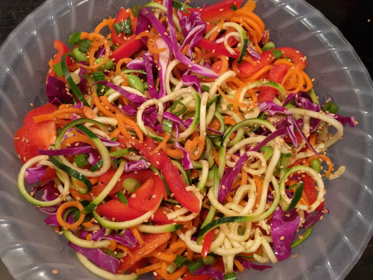 Add all veggies to a bowl and toss to combine. Sprinkle sesame seeds over the top.
