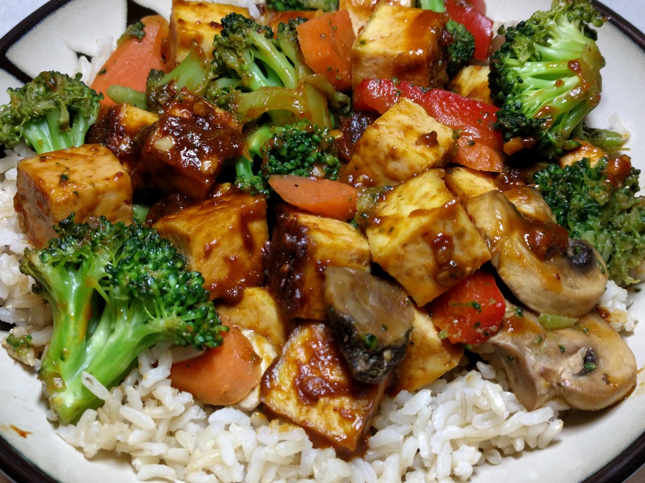 Scoop some brown rice into a bowl, then add scoops of the veggies and tofu on top. Now eat your tasty food.