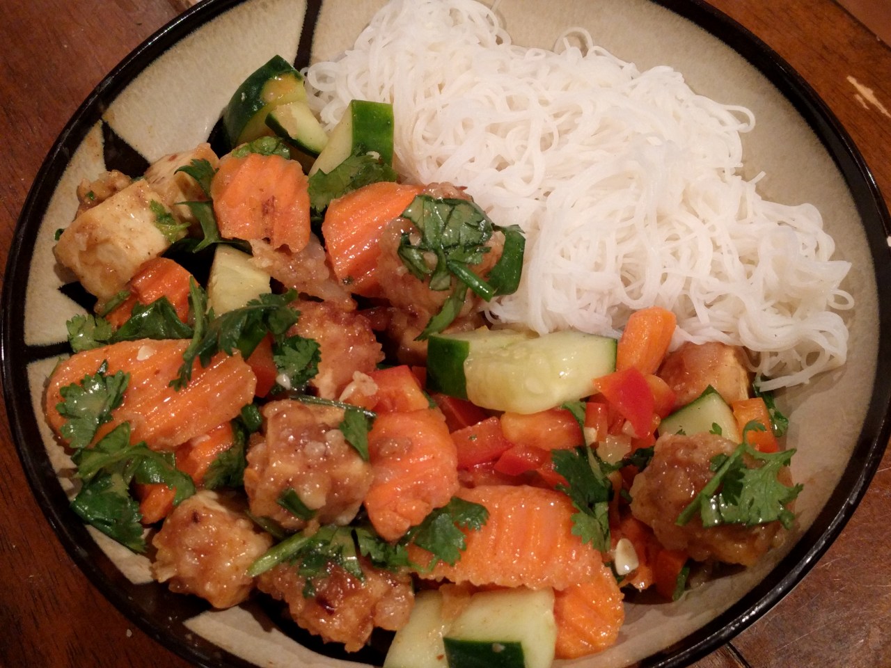 At this point you should have: one bowl of tofu sauce coating, one bowl of salad dressing (or stir-fry sauce, however you’re making this), raw or sautéed veggies, and rice noodles draining in a colander.