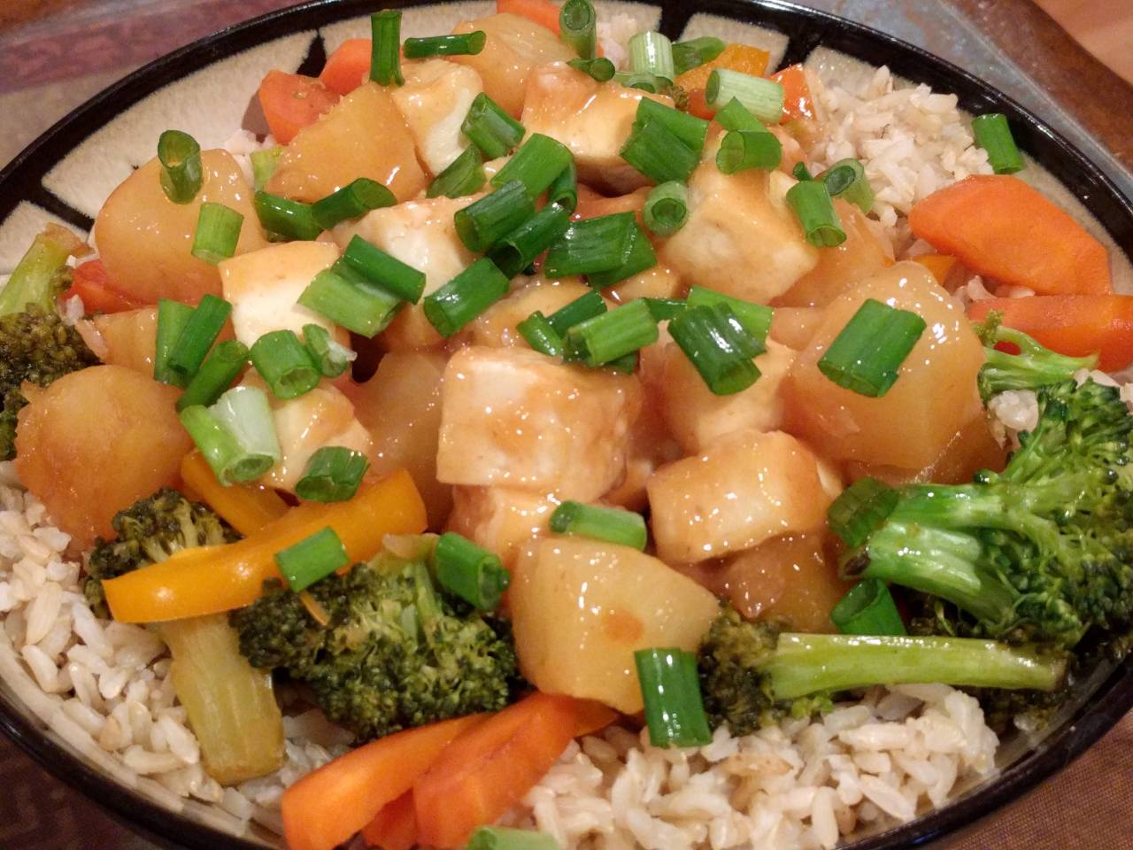 8. To serve, scoop up a large amount of the sweet & sour sauce pineapple/tofu mix and pour/dump it onto a bowl of the rice/veggie stir-fry mix. Done!