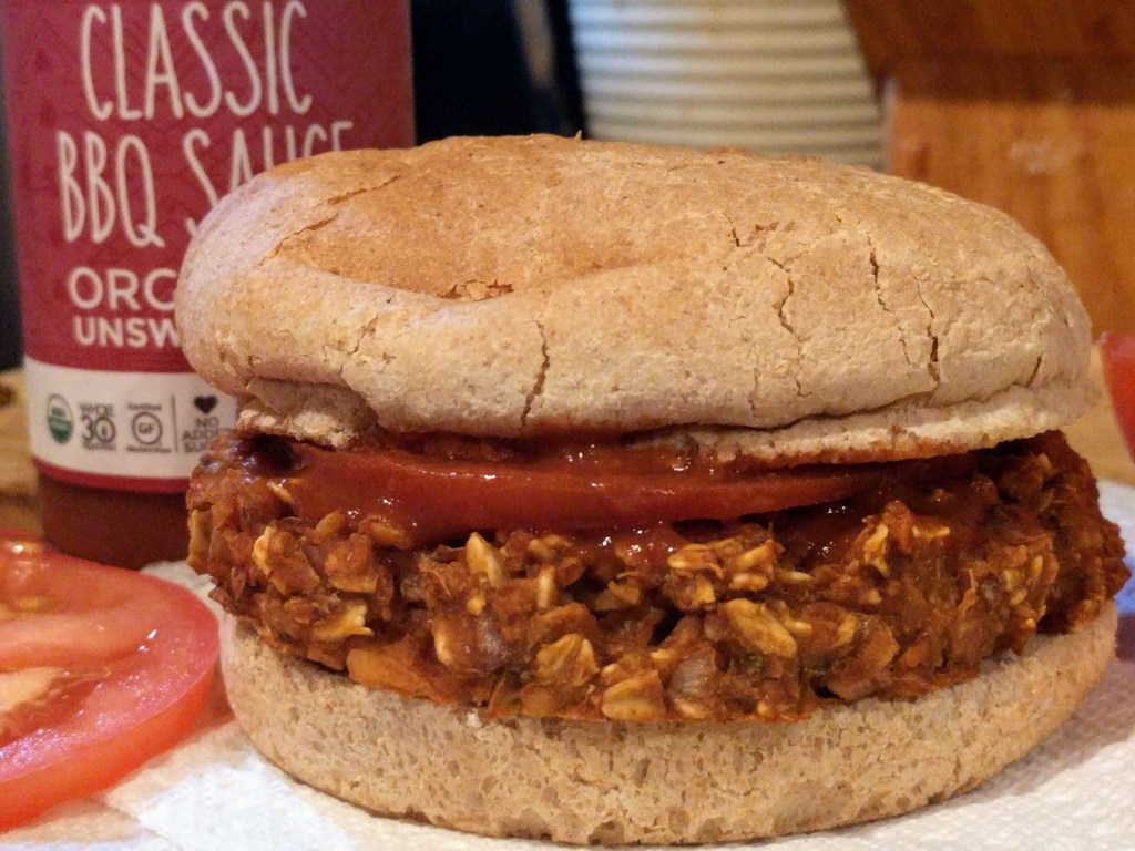 On one of my recent trips to a natural foods store I like to frequent, I was pleasantly surprised to find the brand Primal Kitchen has a “Classic BBQ Sauce” that seems pretty WFPB-friendly. I was skeptical that I’d like it since I’ve never been a big barbecue fan in general, so I only picked up one bottle. I’m regretting that, ’cause I really like this stuff! I’ve been using it as a sauce for my other burgers/sandwiches so far, but I was determined to find a recipe to use it in before my bottle ran out. I ran across a barbecue burger recipe from Fat Free Vegan Kitchen and gave it a whirl. I used oats my first time making it, but I think I’m going to try bread crumbs next time. I’m not convinced I like veggie burgers that are heavy on oats as a binding agent. They hold together pretty well! Make sure you give them time to cool on the pan before trying to move them to a burger bun.