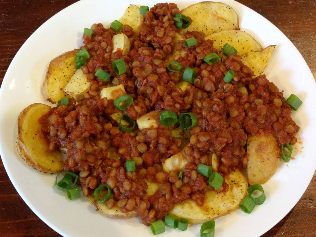 5. When the potato wedges are done, serve with lentils on top and garnish with sliced green onions.