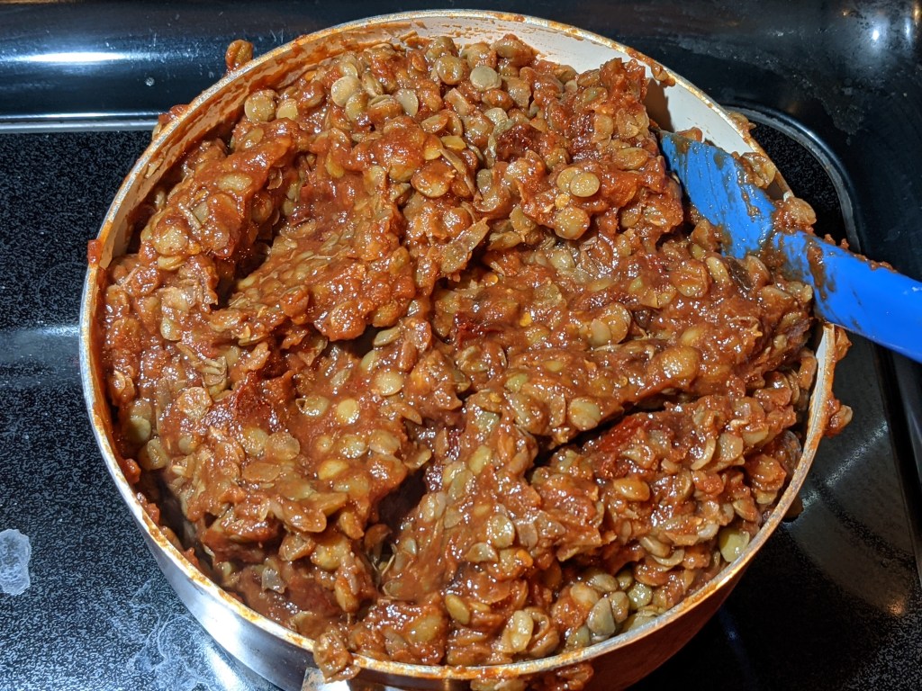 4. Once the lentils are tender, drain the water. Shake to get excess water off. Add the lentils back to the pot and stir in the BBQ sauce. Turn the heat to about medium and cook for a few minutes, stirring often, until the BBQ sauce thickens up a little. The lentils should be coated in sauce.