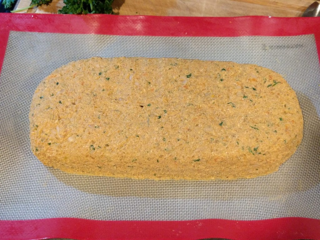 5. Line a baking sheet with a silicone baking mat (recommended!) or with parchment paper. Spoon the tofu mixture onto the pan. Using your hands, shape the tofu mix into an oblong or oval loaf about 2½-inches high (tip: dampen your hands with water to keep the mix from sticking). Bake the loaf for 25 minutes or until the top is evenly browned.