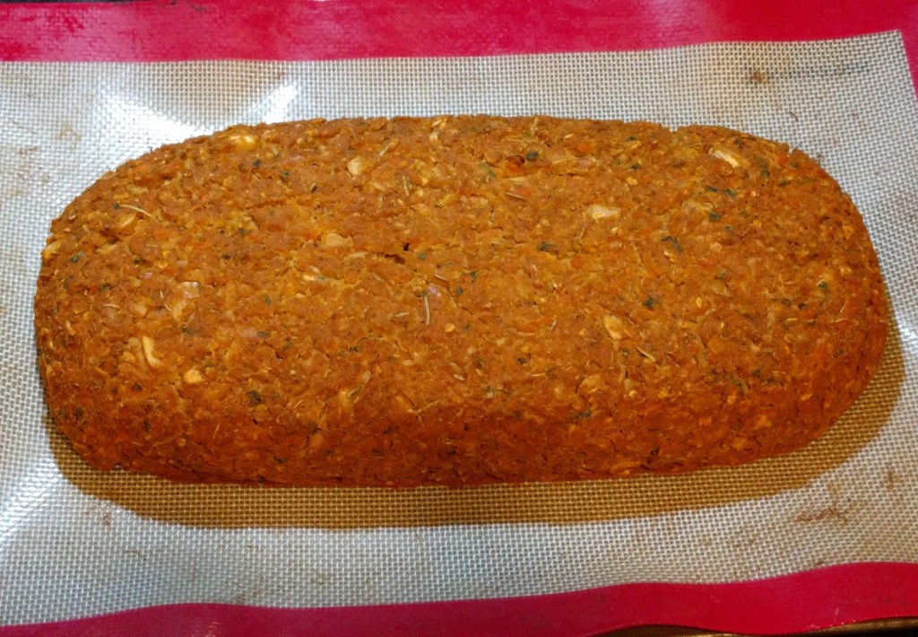 4. First, preheat oven to 375ºF so it has some time to come to temperature before step 5. Place the peeled sweet potato into the food processor along with the tofu, soy sauce, tomato paste, and all the seasonings (spicy brown mustard through nutritional yeast). Process until fairly smooth. If you’re using walnuts, add them at this time and pulse the mixture a few more times. Scrape the tofu mix into a large mixing bowl. Add the quinoa flakes (or quick oatmeal) and the cooked vegetables. Stir well.